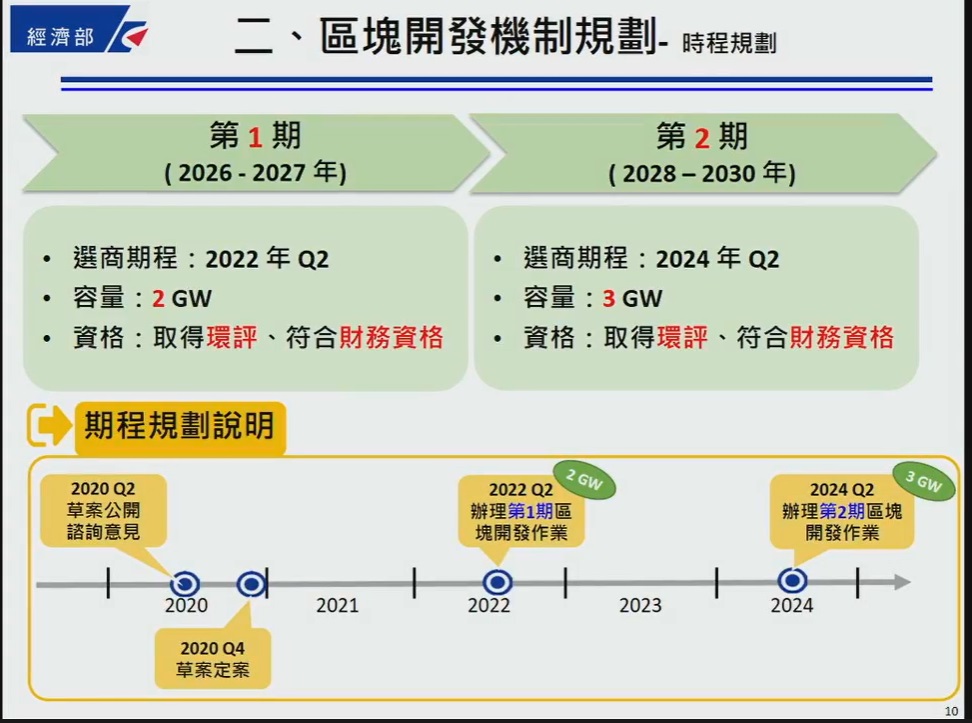 針對區塊階段開發時程規劃,能源局預計在年底做區塊開發定案跟啟動公告等相關作業。第一階段兩期辦理之時程(併網年度2026年至2027年),能源局規劃在2022年的第二季辦理選商作業。第二階段(併網年度2028年-2030年)3GW能源局規劃在2024年Q2啟動選商作業。